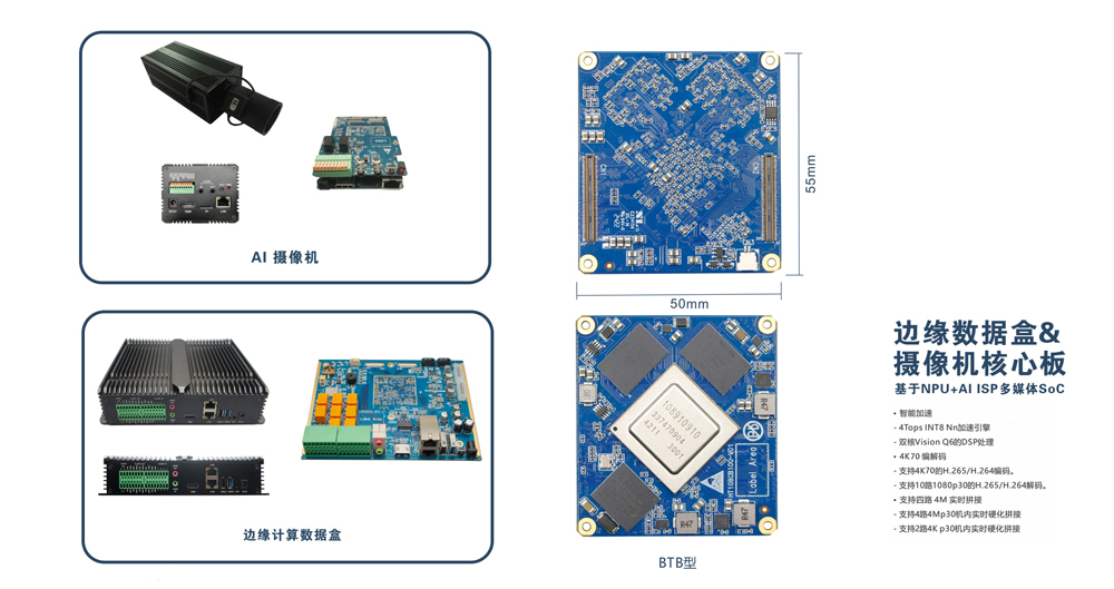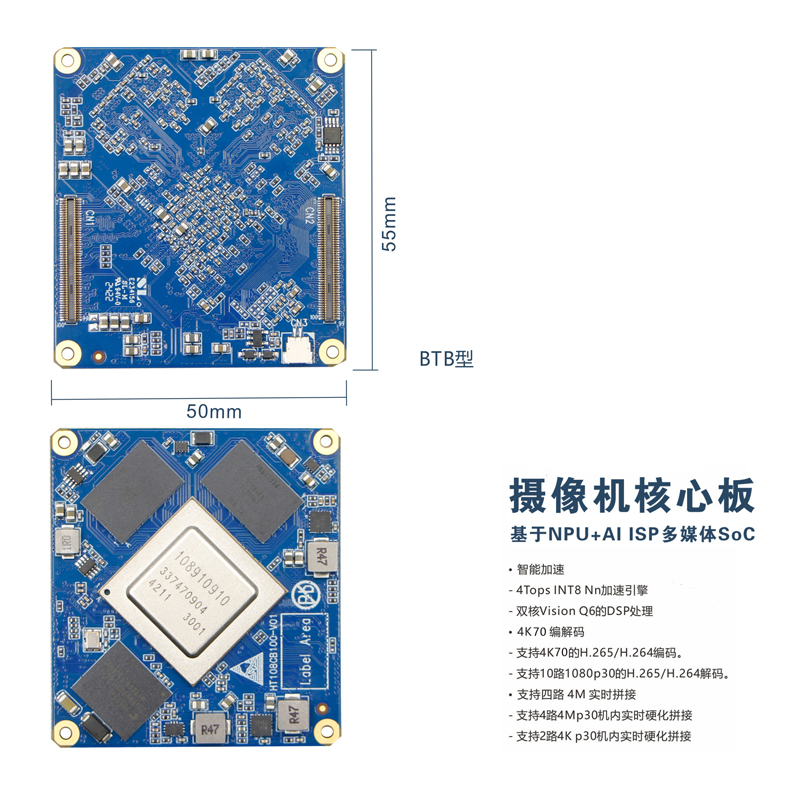 基于NPU+AI ISP的SoC 媒体处理芯片开发的编解码核心板,用于给开发者展示芯片强大的多媒体功能和丰富的外围接口,同时为开发者提供 基于SoC的产品硬件PCBA,将芯片具备的资源完整开放出来,可根据各种使用场景设计相应的底板,模块的设计降低了的开发周期和开发成本与风险。